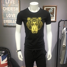 欧洲站夏季丝光棉短袖t恤男士休闲刺绣欧美简约老虎头男装半袖潮