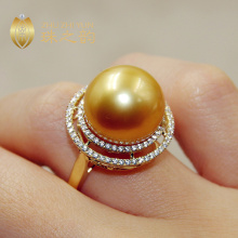 超大颗南洋金珠天然海水珍珠戒指18k金镶钻正圆无暇强光浓金奢华