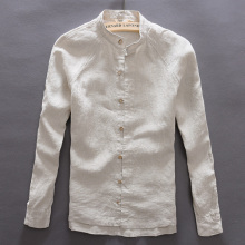 清爽透气白色小立领亚麻衬衫男休闲柔软长袖修身小清新棉麻衬衣男