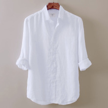 夏季防晒白色清新小翻领长袖纯亚麻衬衫男士休闲修身棉麻衬衣男装