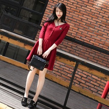 宝宝狮子2017春季新款收腰显瘦V领针织A字连衣裙伞裙打底裙M2038