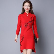 秋冬新款女装民族风绣花旗袍中长款立领复古连衣裙长袖针织毛衣裙