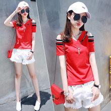 秋天的小店2017夏季新款V领百搭拼接金属装饰露肩短袖修身t恤女LG