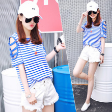 秋天的小店2017夏季新款韩版学生宽松条纹镂空印花T恤短袖女潮SS