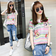 限时100件 8.8折抢购2017春夏新款拼色拼接休闲彩条短袖T恤女上衣