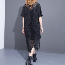 2017春装新品宽松中长款五分袖圆领后背镂空拼接蕾丝纯色T恤女
