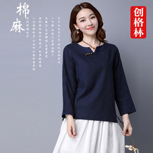 2017春夏新款民族风女装棉麻七分袖宽松t恤女盘扣亚麻打底衫上衣