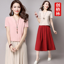 棉麻连衣裙夏2017新款大码两件套女民族风短袖松紧腰亚麻套装裙女