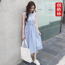 创格林文艺春夏小清新学院风无袖背心连衣裙棉麻格子长款连衣裙夏