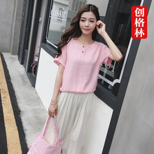 棉麻短袖t恤女宽松大码韩范上衣2017春夏季新款纯色亚麻打底衫女