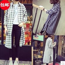 韩版复古格子宽松中长款开叉衬衫女夏季新款长袖衬衣防晒风衣外套
