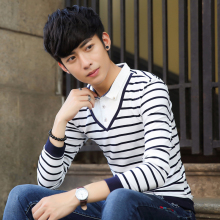 秋装新品男士长袖T恤条纹上衣日系修身假两件打底衫衬衫领潮秋衣