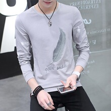 春秋季韩版男士长袖T恤男青少年V领修身男装体恤纯棉打底衫印花潮