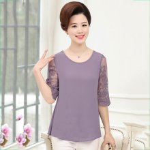 中老年女装夏装纱袖雪纺T恤妈妈装短袖上衣中年妇女夏季打底衫女
