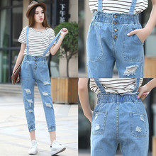 2017春装新款牛仔背带裤女韩版学生九分裤破洞显瘦宽松高腰连体裤