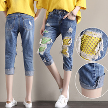 新款渔网袜破洞牛仔裤女2017春夏新款大码乞丐裤宽松直筒九分裤潮