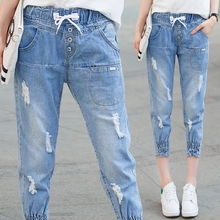 松紧腰带宽松休闲哈伦裤学生七分牛仔裤女夏新款马裤小脚7分裤女