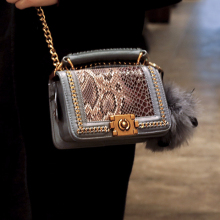 真皮蛇纹链条包小香风真皮女包单肩斜挎手提包春夏款迷你毛球小包