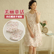 睡衣女夏天睡裙纯棉夏季款中裙全棉纱布短袖家居服连衣裙公主清新