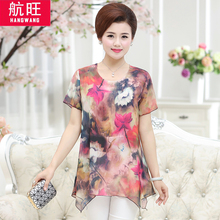 航旺妈妈装夏装短袖雪纺衫中老年女装假两件中年大码上衣印花雪纺