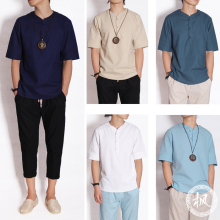 中国风男士棉麻T恤宽松薄款亚麻短袖V领简约半袖夏季中式复古男装