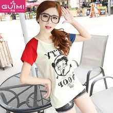 2017夏装新款韩版可爱猫咪印花拼色短袖学生少女T恤半袖体恤上衣