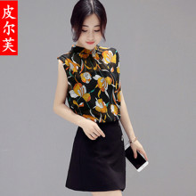 皮尔芙2017夏季新款上衣雪纺小衫短款款收腰显瘦立领领印花女装潮