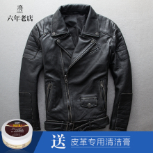 男士真皮皮衣 头层牛皮修身做旧斜拉链机车服皮衣 短款哈雷皮夹克