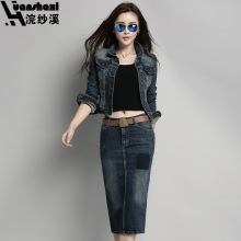 欧洲站2016春秋新款牛仔套装女长袖牛仔短外套包臀半身长裙两件套