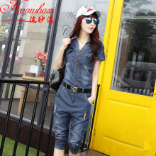 浣纱溪欧洲站2016夏装新款牛仔连衣裤女假两件套装短袖连体九分裤