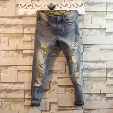 新款夏装英伦个性破洞乞丐风牛仔裤修身小脚九分裤男修身小脚裤子