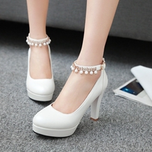 2017春季新款圆头粗跟单鞋女一字扣浅口防水台高跟鞋甜美OL工作鞋