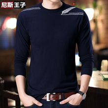 中青年男士长袖t恤男针织打底衫薄款印花圆领春装韩版修身T恤衫