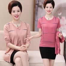 妈妈夏装短袖T恤女2017春新款中老年人女装针织外套开衫两件套