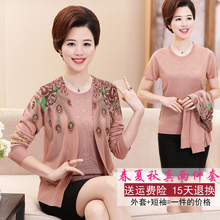 妈妈装春装针织衫真两件套中老年女装长袖T恤40-50岁春秋开衫外套