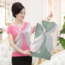 妈妈装夏装短袖T恤V领2017中老年女装桑蚕丝针织衫套头宽松上衣薄
