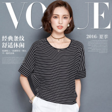 依源色2016夏季新款上衣 大码雪纺衫蝙蝠衫夏女短袖黑白条纹t恤女