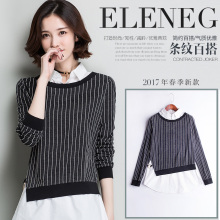 2017春装新款女条纹假两件上衣女衬衫修身百搭春秋季女士长袖衬衣