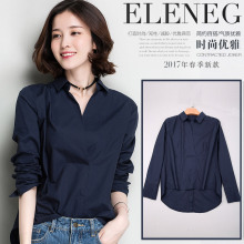 2017春装新款韩版宽松白色衬衫女长袖半开领大码前短后长纯棉衬衣