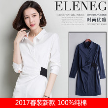 2017春装新款韩版白衬衫女长袖纯棉修身中长款衬衫裙大码衬衣外套