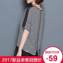 2017夏季新款上衣 大码雪纺衫蝙蝠衫夏女潮短袖黑白条纹t恤女宽松