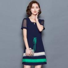 2016夏季女装新款 撞色雪纺a字裙短袖宽松夏天连衣裙收腰中裙显瘦