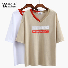 2017夏装新款中袖V领体恤女字母印花修身打底衫韩版宽松短袖t恤