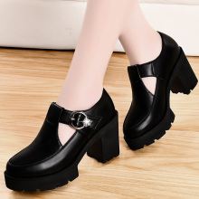 盾狐2017春季新款粗跟单鞋女高跟鞋防水台圆头休闲皮鞋英伦女鞋子