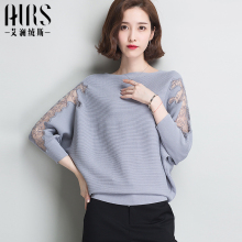 春夏新款女装 蕾丝镂空宽松一字领中袖套头针织衫上衣蝙蝠衫女