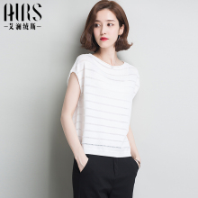 2017夏装新款女装 圆领宽松条纹镂空薄款短袖T恤套头针织衫蝙蝠衫