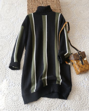 复古竖条纹高感毛混纺高领宽松长款秋冬女装 套头毛衣裙2色