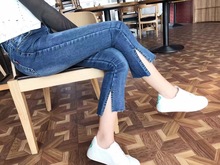 17春夏女装 复古做旧水洗开叉毛边舒适弹力 七八分牛仔裤