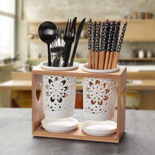 镂空防霉 竹木日式双筒陶瓷筷子筒 沥水筷笼 筷子盒筷子架 筷子笼