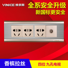 维奈斯118型墙壁开关插座香槟色不锈钢拉丝插座四位九孔+电视插座